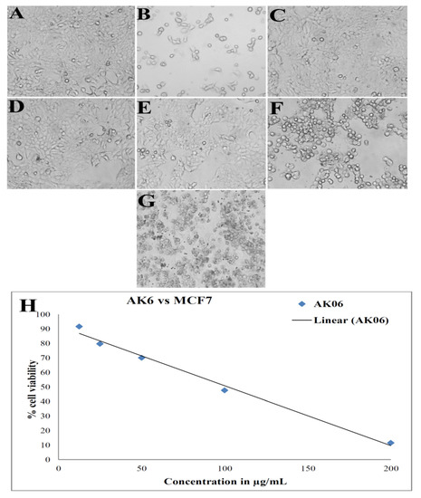 Anticancer activity (MTT assay) of ethyl acetate extract of the Aspergillus niger strain AK-6 against the MCF-7 cell line. (A) Untreated, (B) positive control treated, (C) 12.5 μg/mL, (D) 25 μg/mL, (E) 50 μg/mL, (F) 100 μg/mL, (G) 200 μg/mL, (H) graphical representation of anticancer activity of the Aspergillus niger strain AK-6 extract.