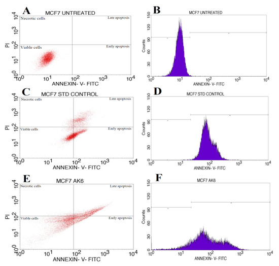 The rate of cell death caused by the ethyl acetate extract of isolate AK-6 extract was studied against MCF-7 cancer cell line. The cultured MCF-7 cells were taken in 96-well plates with a density of 0.5 × 106 cells/2 mL and incubated at 37 °C in a CO2 incubator for 24 h. Further, the cells were treated with IC50 concentrations of ethyl acetate extract of isolate AK-6 for 24 h. The control trial was performed in 2 mL of culture media without treatment of the AK-6 ethyl acetate extract. At the treatment’s end, the cells were subjected to phosphate-buffered saline (PBS) washing. Then the PBS was discarded, and 200 µL of the trypsin–ethylenediamine tetra-acetic acid (EDTA) was amended and kept for incubation for 3 to 4 min at 37 °C. Further, 2 mL of culture medium was added and cells were harvested directly into polystyrene tubes (12 × 75 mm), and centrifugation was performed at 300 rpm for 5 min at 25 °C. Finally, the supernatant was removed and subjected to PBS washing. In total, 5 mL of fluorescein isothiocyanate (FITC) and annexin V were added to create a pellet by gentle vertex and incubated in dark conditions for 15 min at 25 °C; finally, 5 mL of propidium iodide (PI) with 400 mL of 1× binding buffer was added, and analysis was performed by flow cytometry(BD FACS Calibur, Flow Cytometer) [36].