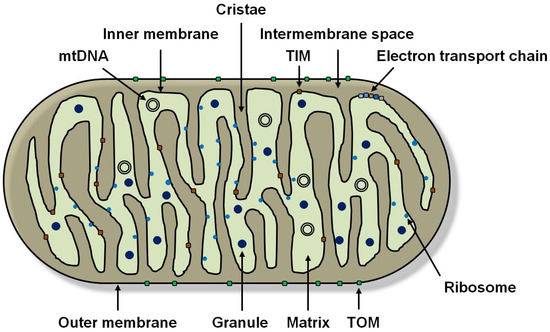 The 16.5 kilobases (kb) mitochondrial genome is double-stranded, circular, and has no histones or introns. In 37 genes, it encodes 2 organelle-specific ribosomal ribonucleic acids (rRNA) related in size and sequence to bacterial rRNA, 22 transfer RNAs (tRNA), and 13 essential mitochondrial proteins [2,10]. Among them, some divergent codons were found in mitochondria. In humans, the mitochondrial code for AUA replaces the normally encoded isoleucine with methionine; AGA and AGG mean “stop” instead of coding for arginine, as normally is the case. These differences between the nuclear and mitochondrial genomes have supported the view that mitochondria in eukaryotic cells were originally symbionts of prokaryotic origin before evolving into obligate components of eukaryotic cells. The “universality of the genetic code” is one of the central laws of molecular biology. It states that the information content of the nucleotide sequence is read and transcribed in the same way by all living organisms. However, mitochondria are also a notable exception to this central point. Mitochondria are generally semi-autonomous organelles and, therefore, have a genome that encodes only a few mitochondrial proteins. Thus, most regulatory factors and structural proteins are encoded by nuclear DNA and must be transported from the cytoplasm to the mitochondria after their synthesis. Even parts of the mitochondrial membrane and many of the enzymes required in them are encoded in the nucleus and must therefore be imported into these organelles. Therefore, it has long been assumed that mitochondria are not viable without the nucleus. However, it is now known that functional mitochondria are not only found in the non-nucleated platelets but can also occur in high numbers as cell-free mitochondria in the blood [11]. During cell division, mitochondria distribute to daughter cells and proliferate by division, which occurs independently and autonomously of the cell. The mitochondria are maternally inherited, which prevents recombination of the mtDNA, e.g., in meiosis [2].