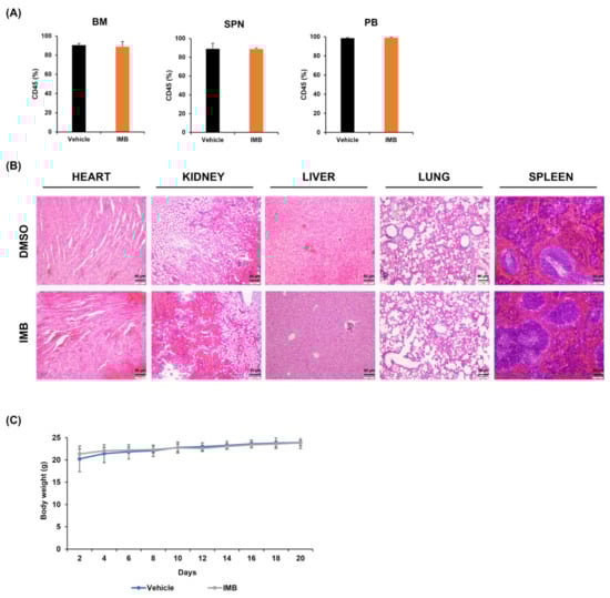 IMB has low toxicity to normal cells. (A) After a vehicle (100 µL of dimethyl sulfoxide, DMSO) or IMB (100 mg kg−1) was injected into athymic nude mice intraperitoneally daily for 21 days, the ratio of leukemic cells in bone marrow, spleen, or peripheral blood was measured by flow cytometry to confirm the toxicity of IMB to nude mice. (B) For histological analysis of the mouse heart, kidney, liver, lung, and spleen, H&E staining was performed. (C) Mouse bodyweights were measured every other day for 21 days while the injection was administered. Statistical significance was measured using the two-tailed one-way ANOVA test.