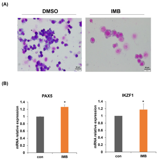 IMB affects the phenotypic differentiation of CCRF-SB cells. (A) CCRF-SB cells were treated with vehicle (DMSO) or IMB (40 µg/mL) for 120 h and Giemsa staining was performed. The images display a representative experiment from three independent experiments. (B) CCRF-SB cells were cultured with IMB (40 µg/mL) for 72 h and mRNA expression of differentiation-related genes (PAX5 and IKZF1) was analyzed by RT-PCR. Statistical significance was measured using the two-tailed Mann–Whitney test (* p < 0.05).