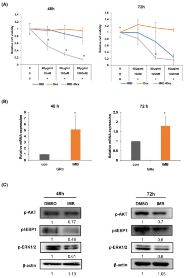 Cotreatment with IMB and dexamethasone (Dex) overcame glucocorticoid resistance. (A) CCRF-SB cells were exposed to IMB (0, 40, 50, or 60 µg/mL) and/or Dex (0, 10, 100, or 1000 nM) for 48 h or 72 h, and the MTS assay was performed to measure cell viability. (B) CCRF-SB cells were treated with IMB for 48 h or 72 h, followed by mRNA expression analysis of the glucocorticoid receptor alpha (GRα) gene by RT-PCR. (C) Western blotting was performed to determine the expressions of p-Akt, p-4EBP1, Bcl-2, Mcl-1, and p-Erk1/2 in CCRF-SB cells. β-actin was used as a loading control. Statistical significance was measured using the two-tailed Mann–Whitney test or the two-tailed one-way ANOVA test (* p < 0.05).