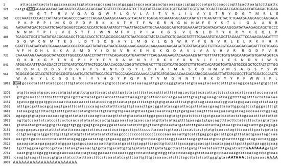 A novel CgFUT1 gene from C. gigas was cloned and characterized using RACE. The complete cDNA sequence of CgFUT1 was 3024-bp and comprised a 127-bp 5′-untranslated region (UTR), 1940-bp 3′-UTR with a poly(A) tail, and 957-bp open reading frame encoding a predicted polypeptide of 318 amino acids (Figure 1). The deduced amino acid sequence contained a transmembrane region with 20 amino acids (13–32), with a Pfam domain from amino acids 16–319. The theoretical isoelectric point and molecular weight of mature CgFUT1 were 9.51 and 37,189.90 Da, respectively.