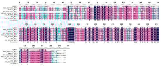 Figure 2. Multiple alignments of amino acid sequences of CgFUT1 with seven different species of FUT1. Identical and similar sites are shown in black and red shades, respectively. Related proteins: Homo sapiens NP_000139.1, Oryctolagus cuniculus NP_001075872.1, Mus musculus NP_001258910.1, Macaca mulatta NP_001040619.1, Bos taurus NP_803465.2, Canis lupus familiaris XP_038512336.1, and Sus scrofa NP_999233.1.