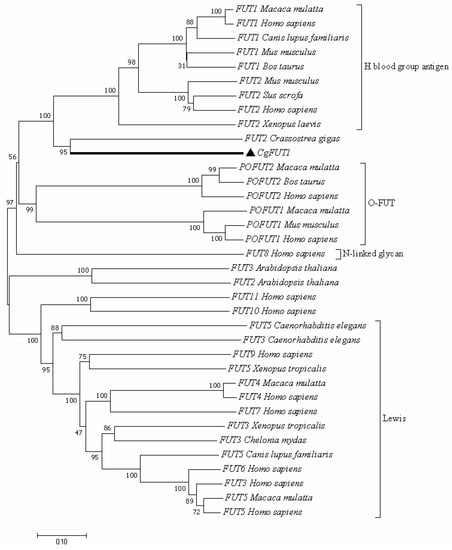 To date, 13 fucosyltransferase genes have been identified in the human genome [27]. As expected, CgFUT1, identified here, is more phylogenetically related to vertebrate FUT1/2, which synthesizes type H-2 blood group antigens, than to FUTs from other species (Figure 3). This indicates that CgFUT1 may synthesize H blood group tissue antigens, consistent with our functional predictions. Notably, phylogenetic analysis of FUT revealed that the development distance of vertebrate FUT1 was longer than that of CgFUT1, which was perhaps due to the large species differences between mollusks and vertebrates. The similarity between FUT1 and FUT2 as a homologous pair of genes would also prevent CgFUT1 from being accurately classified.