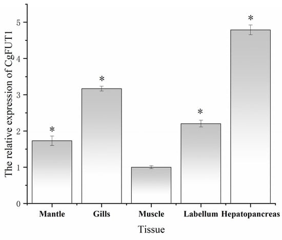 The expression levels of CgFUT1 mRNA in different C. gigas tissues were detected via RT-qPCR. The mRNA transcripts of CgFUT1 were expressed in the mantle, gill, muscle, labellum, and hepatopancreatic tissues. The lowest level of CgFUT1 expression was in muscles, and expression in the hepatopancreas was more than four-fold that of muscles. The expression levels in mantle, gill, and labellum tissues were two-to-three-fold that of muscle tissues (p < 0.05) (Figure 4).