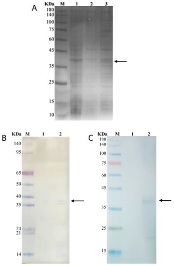 The inducible expression of CgFUT1 recombinant protein was performed using pET–CgFUT1. In addition to the expression of the recombinant plasmid, E. coli BL21 (DE3) without pET–CgFUT1 and E. coli BL21 (DE3) with the pET-28a(+) vector were used as controls. The results showed that a protein band with a molecular size of ~38.0 kDa was observed in the third lane (Figure 5A), which was consistent with the predicted results of the ExPASy tool. Unfortunately, CgFUT1 protein does not seem to be overexpressed in E. coli. Subsequently, Western blotting using anti-6×His-tagged mouse monoclonal (Figure 5B) and anti-human FUT1 protein rabbit polyclonal (Figure 5C) antibodies showed a band of ~38.0 kDa in lane 2, whereas lane 1 (controls) showed no band. This result confirmed the successful expression of CgFUT1 after transformation and the similar immunogenicity of recombinant CgFUT1 protein to that of human FUT1 protein.
