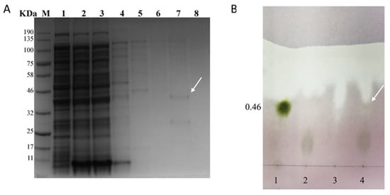Figure 6. (A) SDS–PAGE analysis of purified CgFUT1 protein. M, protein molecular weight standards; lane 1, total protein of induced recombinant bacteria; lane 2, total protein of induced recombinant bacteria in supernatant; lane 3, flow-through liquid; lane 4, 10 mmol imidazole wash fraction; lane 5, 20 mmol imidazole wash fraction; lane 6, 50 mmol imidazole wash fraction; lane 7, 250 mmol imidazole wash fraction; and lane 8, 500 mmol imidazole wash fraction. (B) TLC analysis of CgFUT1 recombinant protease activity. Lane 1, Fucα1-2Galβ1-4GlcNAc; lane 2, Galβ1-4GlcNAc+UDP-Fuc; lane 3, CgFUT1 protein solution; and lane 4, reaction mixture of Galβ1-4GlcNAc+UDP-Fuc and CgFUT1 protein.