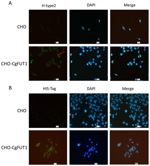 The localization of CgFUT1 (the gene expression product) and H-2 HBGA-like molecules (the catalytic synthesis product) in CHO cells was detected via immunofluorescence (Figure 7), which revealed that the former was mainly present in the cytoplasm, whereas the latter was present in the cell membrane.
