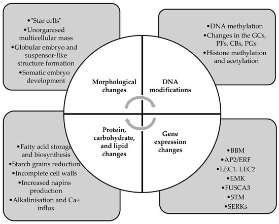 Even though microspore embryogenesis has been a widely utilized and studied method for haploid and double haploid production, molecular mechanisms of developmental program transition in rapeseed are still not clear. It is known that several basic metabolic and cellular processes take place during gametophytic to sporophytic transition. Morphological changes in microspores are accompanied by alterations in gene and protein expression patterns, as well as a decrease in lipid and carbohydrate content in the cells (Figure 2) [38].