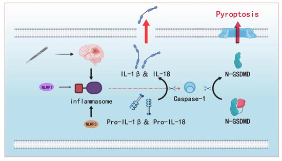 In the canonical inflammasome pathway, formed inflammasomes [73] bind to pro-caspase-1, pro-IL-1β, and pro-IL-18. Caspase-1 is activated first, followed by shearing to produce IL-1β and IL-18 [74]. IL-1β and IL-18 simultaneously cut GSDMD to separate its N- and C-termini. At this point, N-GSDMD is combined with membrane oligomerization, forming pores on the membrane [52], promoting the release of IL-1β and IL-18, and inducing a cascading immune response [75]. On the one hand, pyroptosis can affect brain functions, such as consciousness and language, through programmed neuronal death [76]. However, it also affects neuronal function and causes synaptic loss through the production of ROS, IL-1β, and IL-18 [77]. In addition to affecting the activation and distribution of microglia, astrocytes indirectly affect the internal environment of the nervous system and neurotransmitter production [78]. The hippocampus is an important organ for processing memory and consciousness in humans, and is more susceptible to damage from external sources because of its specific structure. Specifically, unlike other brain structures, the basal membrane covers only 30% of the vascular surface in the hippocampus, which facilitates the penetration of hormones and inflammatory factors into hippocampal neurons [79]. The use of ulinastatin to inhibit the release of pyroptosis-related molecules such as IL-1β and the inhibition inflammasome formation can effectively reduce the degree of inflammation in nerve cells [58]. In addition, cortical neurons, which are responsible for higher levels of consciousness and language, are also affected by pyroptosis [80]. Furthermore, its upstream target molecule, TNF-α, modulates the glutamate metabolism to produce excess glutamate, leading to toxicity, disturbing the balance between excitation and inhibition, and reducing neuronal excitability and synaptic activity [81] (Figure 2).