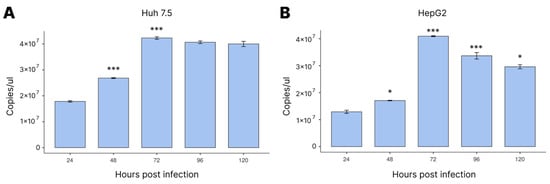 Quantifying viral load in the culture supernatant by RT-qPCR in the ViiA 7 platform as a function of time after DENV-4 infection in Huh 7.5 (A) and HepG2 (B) cells. Cells were infected with MOI = 1. Statistical analysis was performed using ANOVA with a Tukey post hoc test. * p < 0.05, *** p < 0.001.