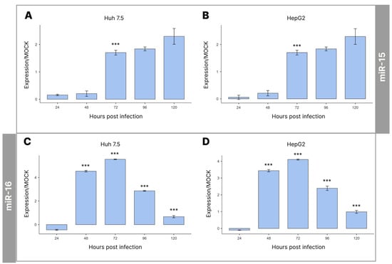 Quantification of miRNA-15 (A,B) and miRNA-16 (C,D) levels as a function of time after infection of Huh 7.5 (A,C) and HepG2 (B,D) cells with DENV-4 by RT-qPCR with ViiA 7 platform. Cells were infected with MOI = 1. Statistical analysis was performed using ANOVA with a Tukey post hoc test. *** p < 0.001.