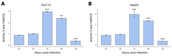 Quantification of caspase-3/7 activity as a function of time after infection of Huh 7.5 (A) and HepG2 (B) cells with DENV-4 by luminescent assay using the GlomaxMult+ platform. Cells were infected with MOI = 1. Statistical analysis was performed using ANOVA with a Tukey post hoc test. ** p < 0.01, *** p < 0.001.