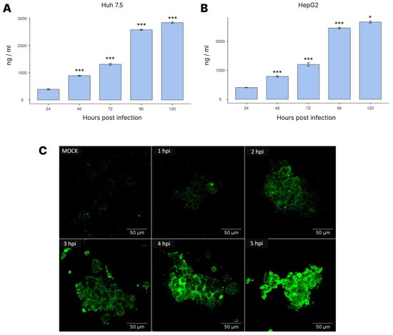 Quantification of NS1 levels in Huh 7.5 (A,C) and HepG2 (B) cells following DENV-4 infection by enzyme immunoassay (A,B) using the GlomaxMult+ platform; laser-scanning confocal fluorescence microscopy using FITC-conjugated DENV NS1 polyclonal antibody (C). Statistical analysis was performed using ANOVA with a Tukey post hoc test. Cells were infected with MOI = 1. * p < 0.05, *** p < 0.001.