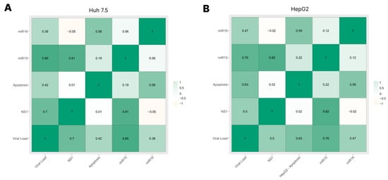 An analysis of the correlations among the previously obtained data was performed (Figure 5). We observed that the Huh 7.5 and HepG2 cell lines behaved similarly, with a high positive correlation between miRNA-15 expression and both NS1 levels and viral load and a moderate positive correlation between miRNA-16 expression and caspase-3/7 activity.