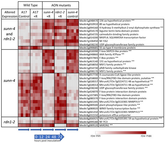 Genes with constitutively altered expression in roots of AON mutants sunn-4 and rdn1-2. Heat map of average fragments per kilobase of transcript per million mapped reads (FPKMs) of genes identified by DeSeq2 with altered expression levels in AON mutants compared to wild-type (A17) that were consistent across all times and conditions (control = no rhizobia; +R = with rhizobia). Each row is independently scaled from minimum to maximum values; underlying data are in Supplemental Dataset 2, sheet F1. Expression of some genes was altered in both mutants, while for others the difference was only found in one mutant. Some genes had higher expression in the mutants and some had lower. The geneID (v4) and annotation are given. For five geneIDs, the annotation in v5 better matched the transcript structure; the v5 geneID is also given for these, with two pairs of geneIDs merged into two larger genes in v5. ** Also found to be similarly different in shoots of AON mutants (see Figure 2).