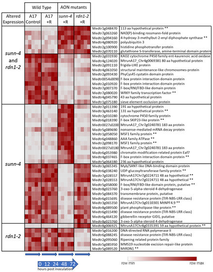 The predicted MYB family transcription factor gene (Medtr3g111880), found to be uninduced in sunn-4, increased expression in wild-type by 24 hpi, but by 72 hpi there was still no increase detected in sunn-4 (Figure 7B). In the rdn1-2 mutant, expression levels increased but on a slower time frame than in wild-type, with the first increase seen at 48 hpi. This gene was also found to be induced by rhizobia by 48 hpi in roots, where the AON mutants both showed a stronger induction of expression than wild-type.