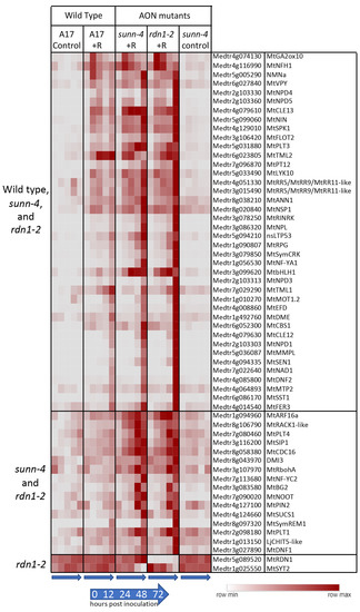 The root dataset consists of 75 libraries, including 60 libraries from this work (three replicates of five time points each for inoculated wild-type A17, sunn-4 and rdn1-2 root segments, and uninoculated sunn-4 root segments) and 15 libraries from uninoculated wild-type A17 root segments generated in the same way and used in two manuscripts on new analysis algorithms [14,17]. The shoot dataset has 60 libraries (three replicates of five time points each for inoculated wild-type A17, sunn-4, and rdn1-2 and uninoculated A17), including 30 from this work for the two mutants and 30 from wild-type previously reported [17]. Read mapping and alignment data for each library is included in Supplemental Dataset 1. Among the genome v4.1 transcripts identified in our analyses were six that have been updated in v5, merging three pairs of transcripts (Medtr7g028557 and Medtr7g028553, Medtr3g065345 and Medtr3g065350, and Medtr0027s0200 and Medtr0027s0180) into three genes (MtrunA17Chr7g0224711, MtrunA17Chr3g0110301, and MtrunA17Chr7g0240781, respectively). All the v4.1 transcripts are listed in the figures, but the v5 annotations were used for determining gene totals.