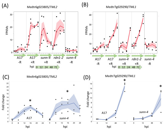 AON genes TML2 and TML1 are induced by rhizobia in both wild type and AON mutant root segments. RNA-seq data shows early induction in response to rhizobia for TML2 (A) and later induction for TML1 (B). The fragments per kilobase of transcript per million mapped reads (FPKMs) (black dots) and means (red lines) of three biological replicates are shown for time points 0 through 72 h post-inoculation (hpi) for uninoculated (−R; wild-type A17 and sunn-4) and inoculated (+R; wild-type, sunn-4, and rdn1-2) root segments. qPCR verified the induction of TML2 (C) and TML1 (D) in both A17 and sunn-4. Expression levels were significantly higher in both wild-type and sunn-4 at 16 hpi for TML2 and at 72 hpi for TML1 (*, p < 0.05; Kruskal–Wallis test with Bonferroni correction). The relative expression of three biological replicates (black dots = data points; blue line = means) of these genes is shown. Shading shows the standard error of the mean.
