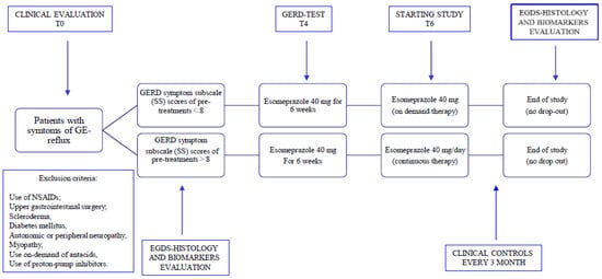 After the follow-up period, patients underwent the last endoscopic control to assess, according to Los Angeles criteria [43], the entity of esophageal mucosal damage after the two different Esomeprazole 40 mg-based regimens. BE was classified according to the recommendations regarding the diagnosis and management of BE [44]. In particular, BE patients underwent biopsies of the epithelium in all four quadrants at a distance of 1 cm along the ectopic area [45]. All samples were stored in a solution containing 10% buffered formalin and subsequently embedded in paraffin. Subsequently, they were subjected to staining based on hematoxylin and eosin combined with an acid pH solution based on alcian blue (pH 2.5).