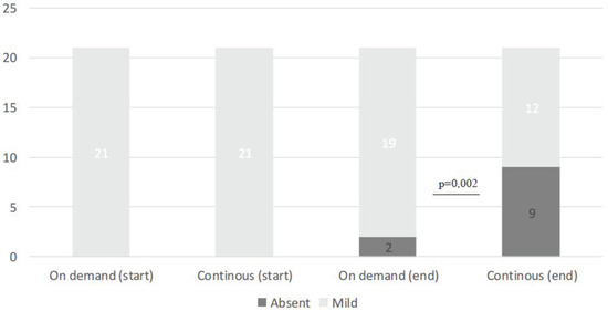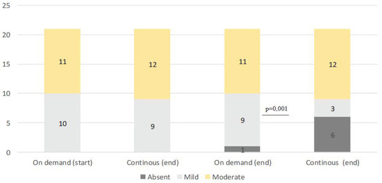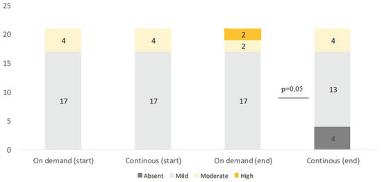 At entry, in patients with BE, mild expression was present in 19 patients (46%) while it was moderate in the other 23 cases. Nine patients with mild expression were assigned to group A and 10 to group B, while of those with moderate expression 12 were assigned to group A and 11 to group B (Table 2). At the final check, Ki67 expression was reduced in 6 (28%) of patients treated continuously versus only one patient (5%) of patients treated on demand (Pearson chi-square: 8.8; fd: 1; p = 0.001) (Table 3) (Figure 4 and Figure 5). No patients experienced increased nuclear Ki67 expression during the follow-up period.