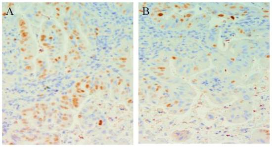 (A) Ki67 expression in patients continuously treated with esomeprazole (nuclear staining recognizable at 10× magnification. (B) Diminution of Ki67 in Barret’s esophagus (nuclear staining recognizable at 10× magnification in less than 50% of positive cells.