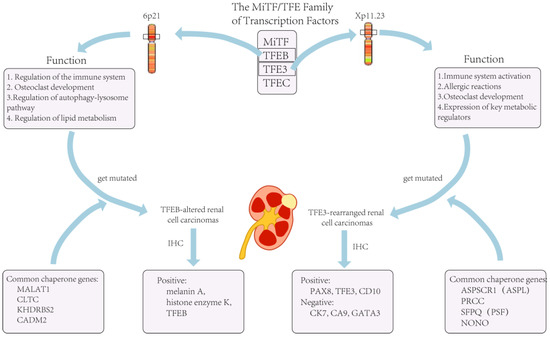 As previously stated, TFEB-altered RCC has been included in the MiTF-translocated carcinoma family and TFEB-overexpressing renal tumors were initially identified in pediatric patients. Nowadays, with the availability of accurate examinations, more and more adult RCC patients are diagnosed with TFEB-altered RCC []. Nevertheless, the number of TFEB-altered RCC cases is still much lower than for TFE3-rearranged RCC []. There are two types of TFEB-altered RCC, including TFEB-rearranged RCC and TFEB-amplified RCC. The TFEB gene in TFEB-rearranged RCC is located on chromosome 6 and is most often translocated into chromosome 11, fusing with the MALAT1 gene. Therefore, it was previously called t(6;11) RCC []. In the last few years, researchers have identified cases of RCC related to TFEB amplification, and after further testing and analysis, it was found that both genetic alteration patterns could co-exist in one case []. Due to the rarity of the disease, there are few studies on the distinction between different subtypes of TFEB-altered RCC, and current case studies show that the mean age of diagnosis for TFEB-amplified RCC is 62.5–64 years, while the mean age of diagnosis for TFEB translocated RCC is 32.8–34 years [,].