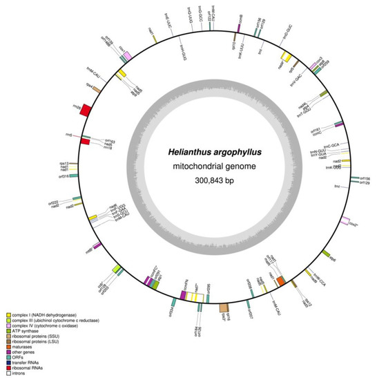 H. argophyllus is the second annual species of the Helianthus genus with an assembled mitogenome. According to the current data, both annual species (H. annuus, H. argophyllus) have similar mitochondrial genome organization, differing from those described in the perennial sunflower species (H. grosseserratus, H. occidentalis, H. strumosus, H. tuberosus) [46,47]. The most notable difference is that annual species have a long repeat region (about 12.9 kbp), which is absent or significantly reduced in perennial species [46,47]. The non-tandem repeats are important for mitochondrial DNA maintenance since they play a role in recombination [51]. Thus, the difference may be essential from an evolutionary point of view.