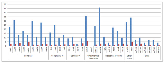 Editing sites were found in all protein-coding mitochondrial transcripts except the atp6 gene. RNA prediction was not performed for rps13 and rpl10 since these genes are absent in Arabidopsis thaliana. However, in the case of reads mapping there were 4 and 5 editing sites located for rps13 and rpl10, respectively. Predominantly, the ATPase subunits, ribosomal proteins (rpl5, rpl16, rps12), and ORFs have a small number of RNA editing-derived substitutions. In contrast, the transcripts of NADH dehydrogenase subunits (nad1, nad2, nad5, nad7), cytochrome c biogenesis genes (ccmB, ccmC, ccmFC, ccmFN), cox1, matR, and mttB have been significantly edited (20–39 sites; Figure 2). When normalizing gene length (100 bp), we discovered a slightly different editing profile. For example, the most edited genes (>3.9 editing sites per 100 bp of gene length) were the following: nad3, nad4L, ccmB, ccmC, mttB (Figure 2). The absolute number of RNA editing sites is usually presented in studies [48,49,50]. However, the gene size significantly differs between mitochondrial genes. We suppose that taking into account the genes size (relative number of RNA editing events) shows more precise results.