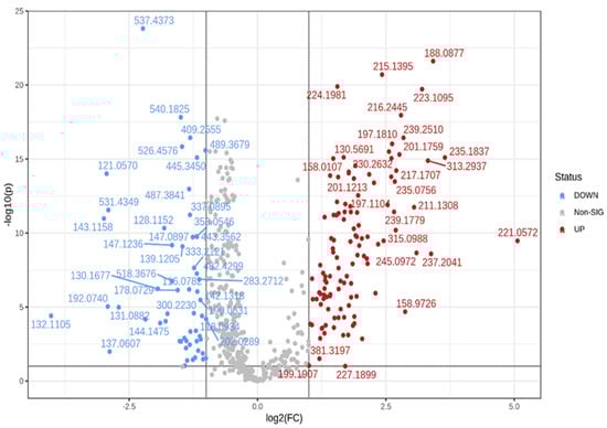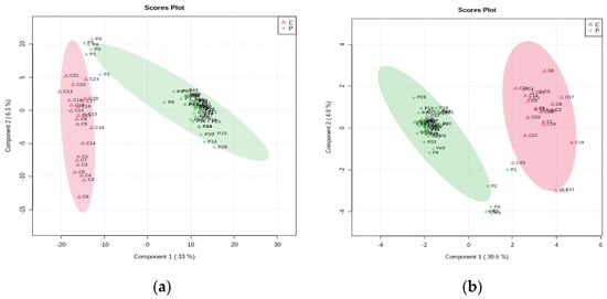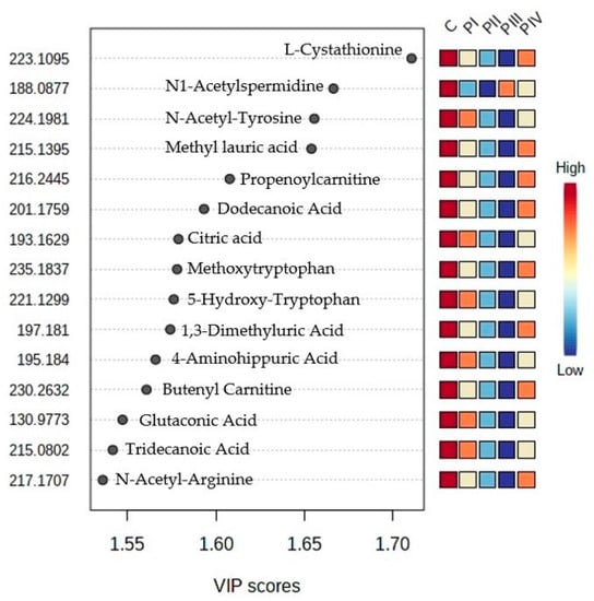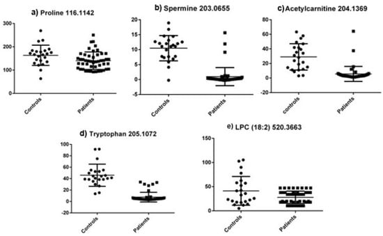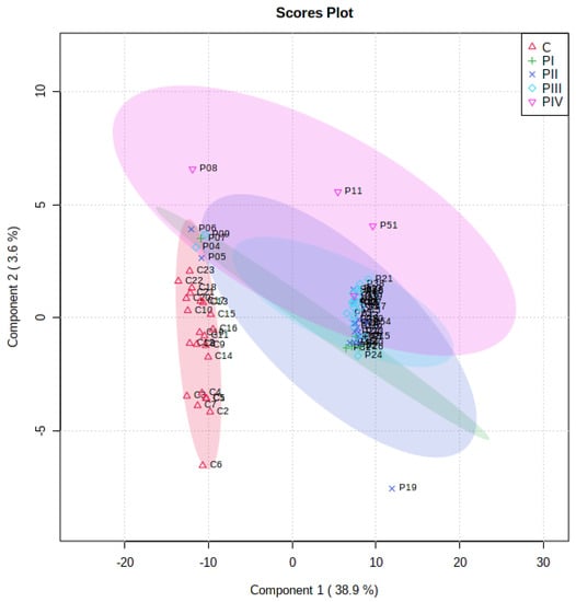 3.2.2. Multivariate Untargeted Metabolomics Statistical Analysis of the 71 Plasma Samples