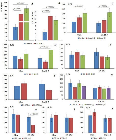 The content of CEA (A) and CA15-3 (B) in the saliva of the control group, with fibroadenomas and in breast cancer. The relative change in the level of tumor markers in saliva compared with the control group depending on the stage of breast cancer (C), the prevalence of regional metastasis (D), the degree of tumor differentiation (E), Ki-67 expression (F), molecular biological subtype (G), HER2 expression (H), estrogen receptor expression (I), and progesterone receptor expression (J). Differences with the control group were statistically significant in all cases (p < 0.05).