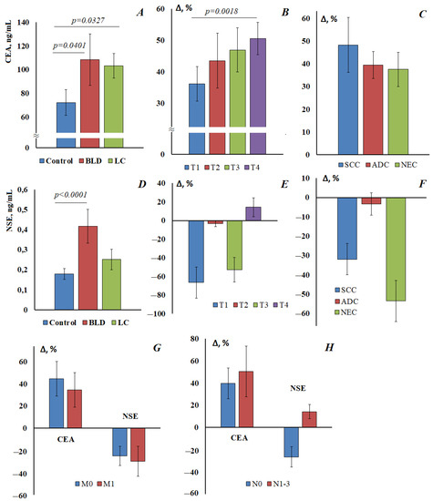 The content of CEA (A) and NSE (D) in the saliva of the control group, with benign lung diseases (BLD) and lung cancer (LC). Relative change in the level of tumor markers in saliva compared with the control group, depending on the stage of lung cancer: (B) CEA, (E) NSE; depending on the histological type of lung cancer: (C) CEA, (F) NSE; depending on the presence/absence of distant metastasis (G) and lymph node metastasis (H). SCC, squamous cell lung cancer; ADC, adenocarcinoma; NEC, neuroendocrine lung cancer. Differences with the control group were statistically significant in all cases (p < 0.05).