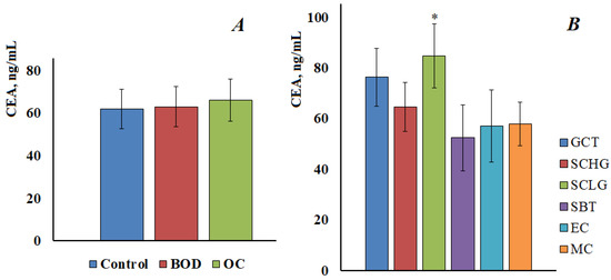 The content of CEA in the saliva of the control group, with benign ovarian diseases and ovarian cancer (A). CEA content in saliva depending on the histological type of ovarian cancer (B). GCT, granulose cell tumor, SCHG, high grade serous carcinoma, SCLG, low grade serous carcinoma, SBT, serous borderline tumor, EC, endometrioid carcinoma, MC, mucinous carcinoma. * differences with the control group are statistically significant, p < 0.05.