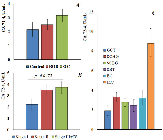 The content of CA 72-4 in the saliva of the control group, with benign ovarian diseases and ovarian cancer (A). The content of CA 72-4 in saliva depending on the stage (B) and the histological type of ovarian cancer (C). GCT, granulose cell tumor, SCHG, high grade serous carcinoma, SCLG, low grade serous carcinoma, SBT, serous borderline tumor, EC, endometrioid carcinoma, MC, mucinous carcinoma. * differences with the control group are statistically significant, p < 0.05.