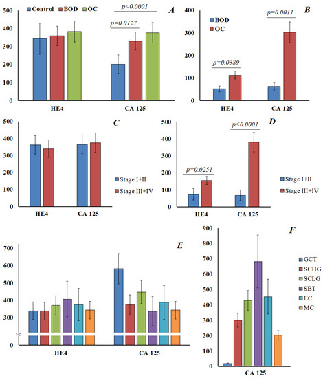 For CA 72-4, the content in the control group was 2.17 [1.21; 2.91] U/mL, with benign ovarian diseases was 2.52 [1.90; 4.46] U/mL, and in ovarian cancer was 3.16 [1.48; 4.82] U/mL (Figure 4A). Thus, there was a tendency to increase the level of CA 72-4, but it was not statistically confirmed. It was shown that the content of CA 72-4 increases at advanced stages of ovarian cancer; the differences between early and advanced stages were statistically significant (Figure 4B). A significant increase in the content of CA 72-4 was shown for ovarian mucinous carcinoma (Figure 4C), in this case, the differences both with the control group and with other histological types of ovarian cancer were statistically significant (p < 0.0001).