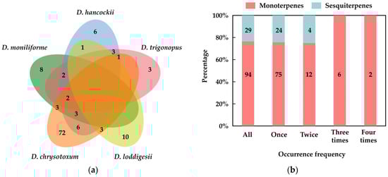 Aromatic terpenes of five aromatic Dendrobium species. (a) Venn diagram of terpenes in five Dendrobium species; (b) occurrence frequency of terpenes in five Dendrobium species.