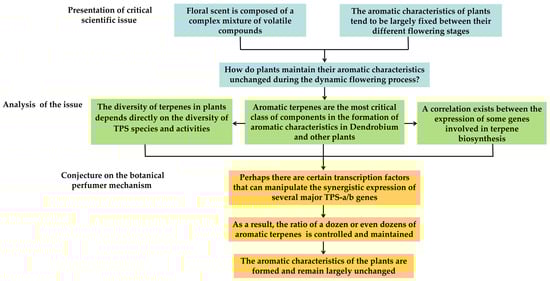 Once the key question is derived, previous research could be systematically organized around it and transformed into a scientific issue. Aromatic terpenes are a dominant factor in the development of aromatic characteristics in Dendrobium, and the diversity of aromatic terpenes in plants depends largely on the type and activity of TPS-a/b. It is not difficult to deduce that TPS-a/b should occupy a central position in the botanical perfumer mechanism. Meanwhile, a correlation exists between the expression of some genes involved in terpene biosynthesis. Moreover, based on the property of TPS as a multiproduct enzyme, a plant could likely control the ratio of a dozen or even dozens of aromatic terpenes by manipulating the synergistic expression of only several TPS-a/b members in its body; this is already sufficient to form its aromatic characteristics.