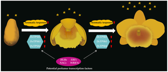 A potential example of the botanical perfumer mechanism in D. chrysotoxum [13]. The red arrows represent the tendency of up-regulation; the number of orange florets characterize the intensity of aromatic characteristics.