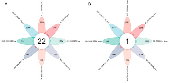 Venn diagram of upregulated and downregulated common DEGs in the eight diseases. (A) Twenty-two overlapping upregulated DEGs. (B) One overlapping downregulated DEG.