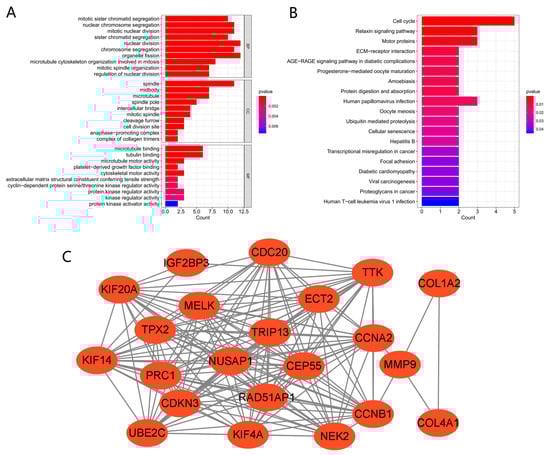 GO, KEGG, and PPI network of common DEGs. (A,B) KEGG and GO pathway enrichment analysis results. p < 0.05 was considered significant. (C) PPI network. Red indicates upregulated genes.