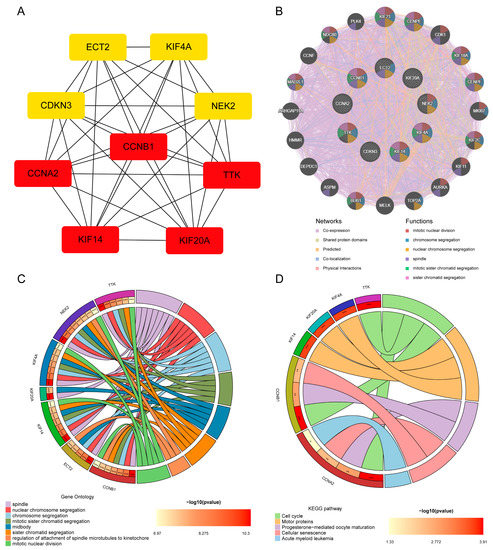 Hub gene analysis. (A) Network of PPI of the top nine hub genes from cytoHubba. (B) Hub genes and their co-expression genes were analyzed via GeneMANIA. (C,D) Analysis by GO and KEGG of hub gene enrichment. (* p < 0.05; ** p < 0.01; *** p < 0.001).