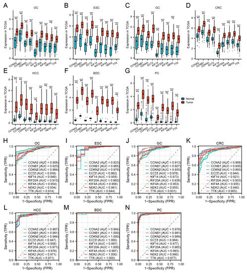 Validation of hub genes in TCGA. (A–G) Hub gene expression levels of OC (A), ESC (B), GC (C), CRC (D), HCC (E), BDC (F), and PC (G) in TCGA cohorts. (H–N) Diagnostic AUCs in seven TCGA cohorts. (*** p < 0.001).