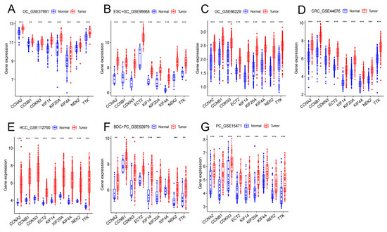 GSE30784 (OC), GSE44021 (ESC), GSE29272 (GC), GSE106582 (CRC), GSE102079 (HCC), GSE26566 (BDC), and GSE62165 (PC) were used as the training sets. We downloaded these datasets from the database of Gene Expression Omnibus (GEO) [27] (http://www.ncbi.nlm.nih.gov/geo, accessed on 1 December 2022).