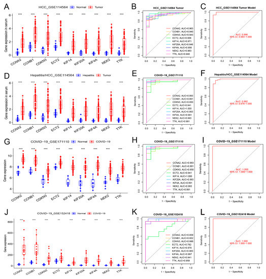 Differential expression, independent diagnostic efficiency, and receiver operating characteristic (ROC) diagnostic model efficiency of hub genes in the blood of patients with HCC and COVID-19. (A–C) Differential expression, diagnostic efficiency, and ROC diagnostic model between normal tissue and HCC (GSE114564). (D–F) Differential expression, diagnostic efficiency, and ROC diagnostic model between hepatitis and HCC (GSE114564). (G–I) Differential expression, diagnostic efficiency, and ROC diagnostic model between normal tissue and severe COVID-19 (GSE171110). (J–L) Differential expression, diagnostic efficiency, and ROC diagnostic model between normal tissue and COVID-19 (GSE152418). (** p < 0.01; *** p < 0.001).
