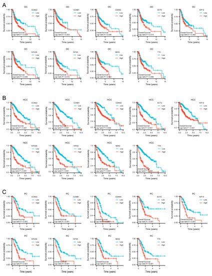 The Kaplan–Meier plots of the nine hub genes demonstrated that higher expression levels indicated poorer OS in TCGA OC, HCC, and PC (Figure 8A–C). These results demonstrated that the hub genes CCNA2, CCNB1, CDKN3, ECT2, KIF14, KIF20A, KIF4A, NEK2, and TTK could predict OS in the OC, HCC, and PC cohorts. This finding further confirmed the value of the nine hub genes.