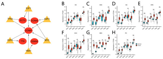 Based on the TRRUST database, we determined that the transcription factors E2F1, E2F3, E2F4, MYC, TP53, and YBX1 might regulate the expression of the nine hub genes (Table 6 and Figure 9A). Verification revealed that the six transcription factors were almost upregulated in TCGA tumor samples of the seven cancers (Figure 9B,C). As the core regulated gene, CCNB1 was regulated by the six transcription factors simultaneously.