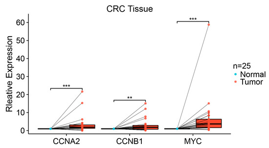 qPCR expression level of CCNA2, CCNB1, and MYC in 25 pairs of colorectal tissues. Each dot represents the expression of normal or CRC sample. (** p < 0.01; *** p < 0.001).