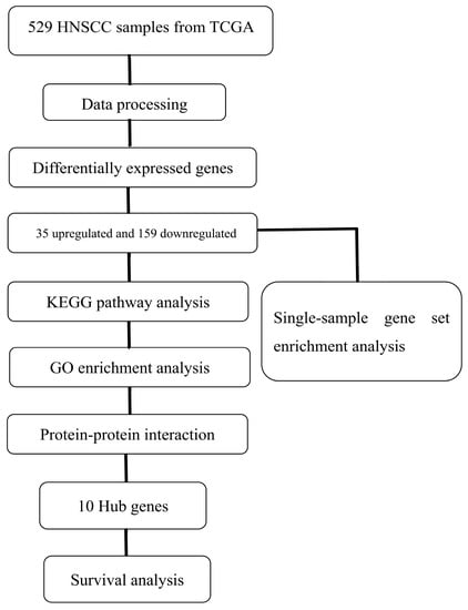 Flow chart of the study. TCGA, The Cancer Genome Atlas; HNSCC, Head and Neck Squamous Cell Carcinoma; KEGG, Kyoto Encyclopedia of Genes and Genomes; GO, Gene Ontology.