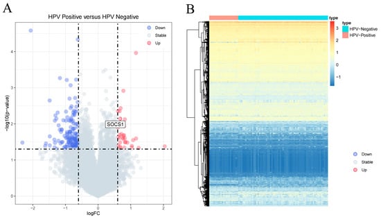 Analysis of differentially expressed genes. (A) Volcano plot of differential genes between HPV-positive sample group and HPV-negative sample group. The X-axis represents the log2 fold change, and the Y-axis represents the −log10 (p value). (B) Heat map; red indicates that the gene expression level is increased, blue indicates that the gene expression level is decreased, purple indicates HPV-negative sample group, and green indicates HPV-positive sample group.